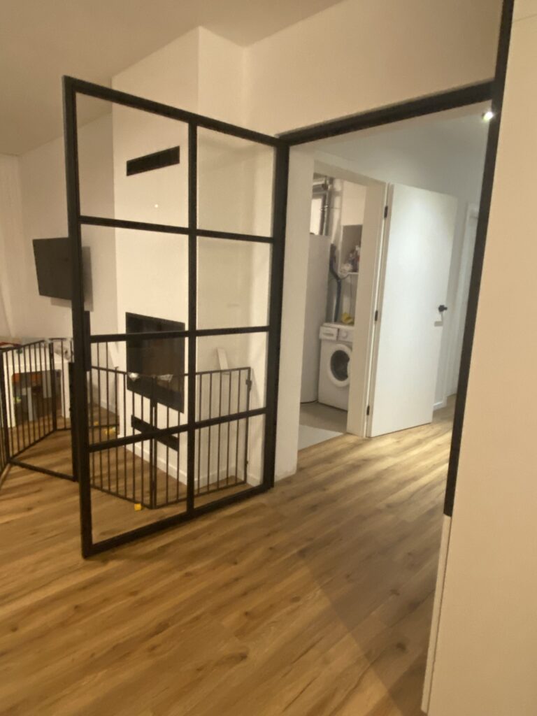 vyrobené z ocelového rámu a kaleného čirého skla. Tento typ dveří je charakteristický svým moderním a minimalistickým vzhledem, který v sobě spojuje eleganci a funkčnost. Dveře jsou dělené do pravidelných geometrických sekcí pomocí minimalistických ocelových příček, které dodávají prostoru industriální a loftový charakter.